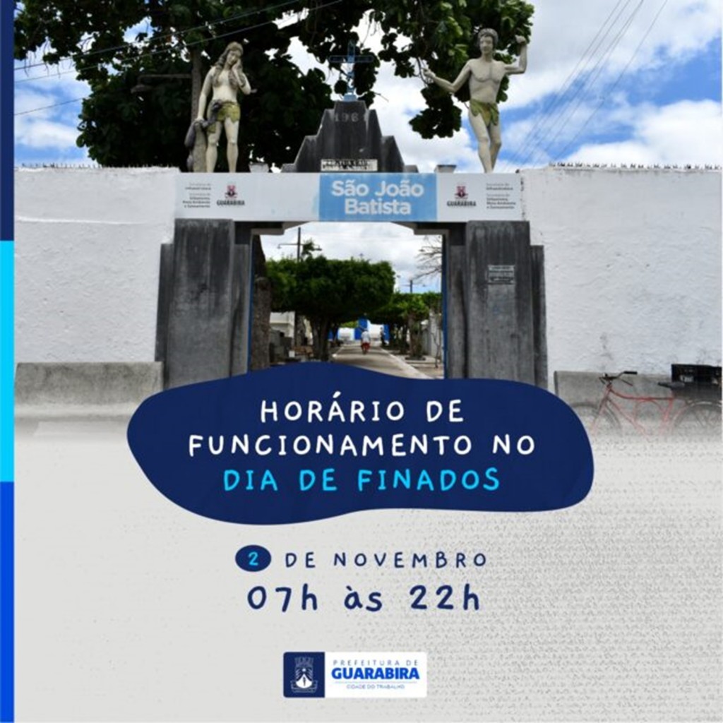 No próximo dia 02 de novembro, data em que é celebrado o Dia de Finados, os cemitérios São João Batista e Bom Jesus estarão com as portas abertas a partir das 07h até às 22h. É recomendado o uso de máscaras e o distanciamento social, em cumprimento das medidas de biossegurança em prol do combate a Covid-19.