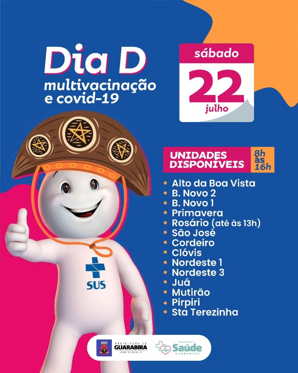 A Prefeitura de Guarabira, por meio da sua Secretaria de Saúde, realiza neste sábado, 22 de julho, o Dia D de Multivacinação e contra Covid-19. E tem como objetivo melhorar as coberturas vacinais da população guarabirense e protege-la de várias doenças.