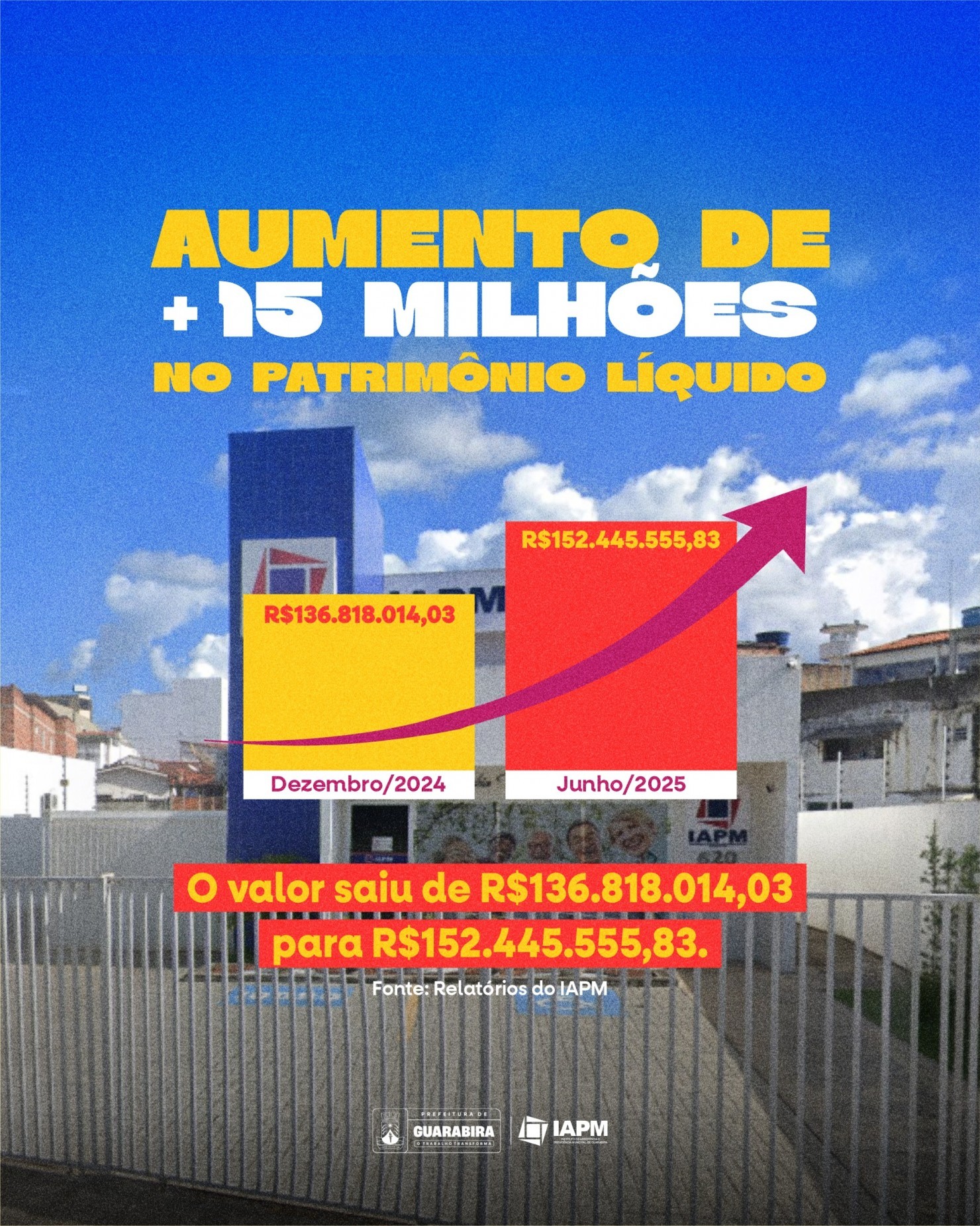 O Instituto de Assistência e Previdência Municipal (IAPM) de Guarabira registrou um crescimento expressivo em seu patrimônio líquido no primeiro semestre de 2025. De acordo com os relatórios oficiais da instituição, o valor subiu de R$ 136.818.014,03, em dezembro de 2024, para R$ 152.445.555,83 em junho deste ano, um aumento superior a R$ 15 milhões.