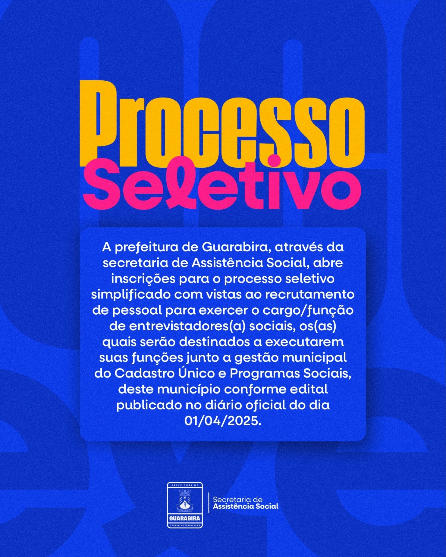 A Prefeitura de Guarabira, por meio da Secretaria de Assistência Social, anunciou a abertura das inscrições para um processo seletivo simplificado destinado à contratação de entrevistadores(as) sociais. Os profissionais atuarão na gestão municipal do Cadastro Único e Programas Sociais, auxiliando na execução de políticas públicas voltadas para a população em situação de vulnerabilidade.