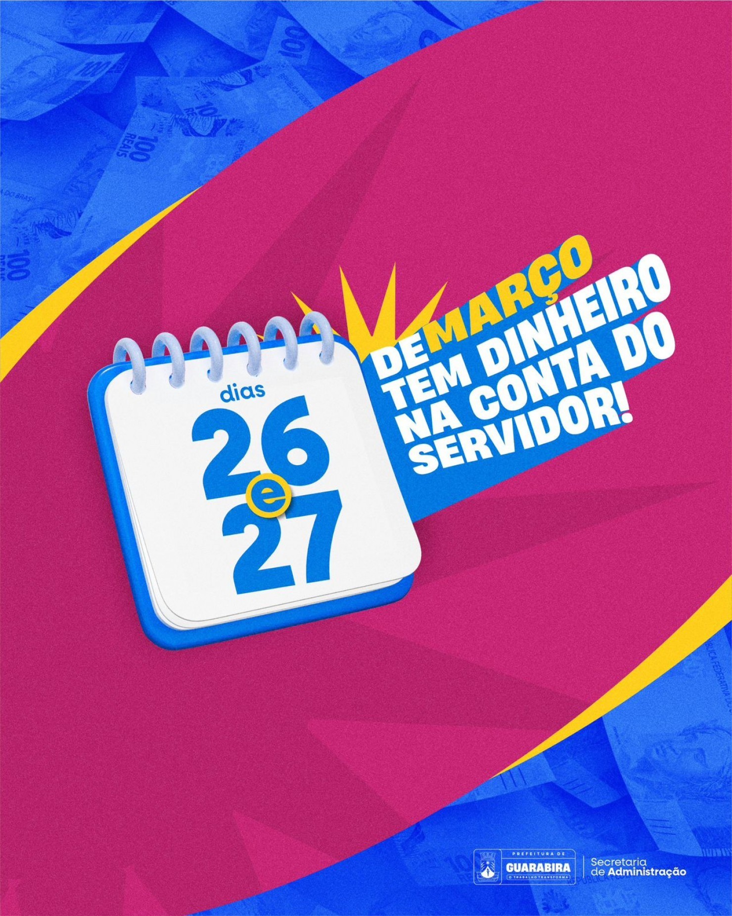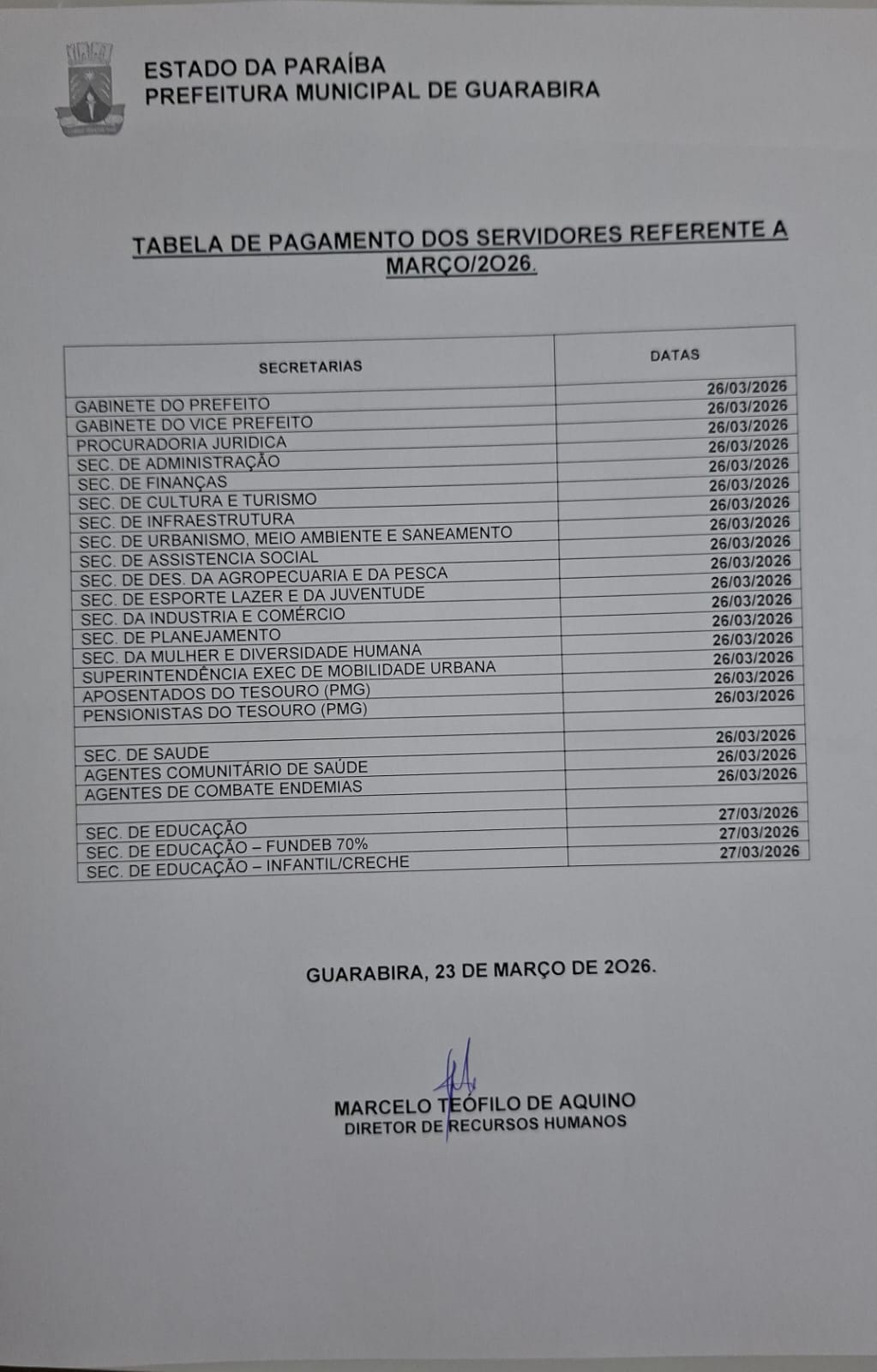 A Prefeitura de Guarabira, por meio da Secretaria de Administração, divulgou o calendário de pagamento da folha dos servidores referente ao mês de março, que será realizado na próxima quinta e sexta-feira, respectivamente, dias 26 e 27.