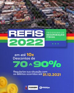 O Programa de Recuperação Fiscal (REFIS 2022), permite que os contribuintes paguem suas dívidas com o município com descontos nos juros e nas multas de atraso. Podem ser regularizados por meio do REFIS 2022 créditos tributários relativos aos Imposto Sobre a Propriedade Territorial Urbana – IPTU; Imposto Sobre Serviço de Qualquer Natureza – ISSQN e as Taxas de competência do município, em razão de situações jurídicas ou fatos geradores, ocorridos até 31 de dezembro de 2021, constituídos ou não, inscritos ou não em dívida ativa, ajuizados ou a ajuizar, com exigibilidade suspensa ou não, vencidos até 31/12/2022.