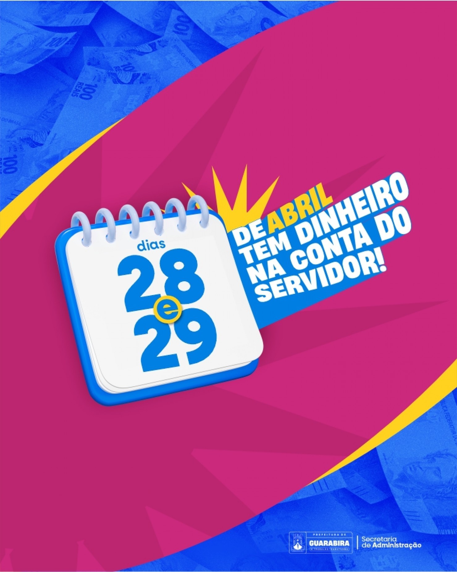 A Prefeitura de Guarabira, através da secretaria de Administração, divulgou nesta quinta-feira, 24, o pagamento da folha dos servidores para os próximos dias 28 e 29 de abril, segunda e terça-feira, respectivamente.