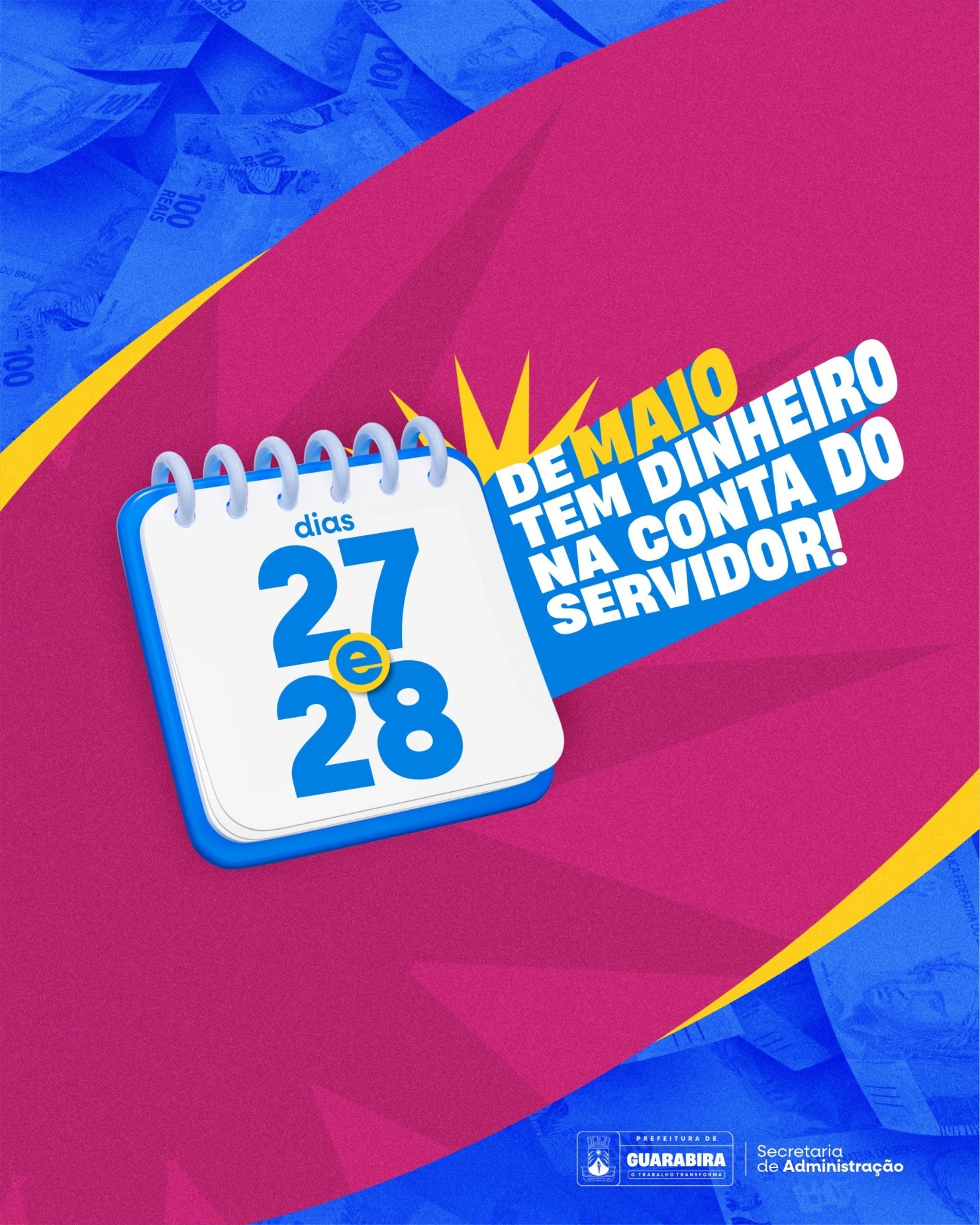 A Prefeitura de Guarabira, através da secretaria de Administração, divulgou nesta quinta-feira, 21, o pagamento da folha dos servidores para os próximos dias 27 e 28 de maio, terça e quarta-feira, respectivamente.