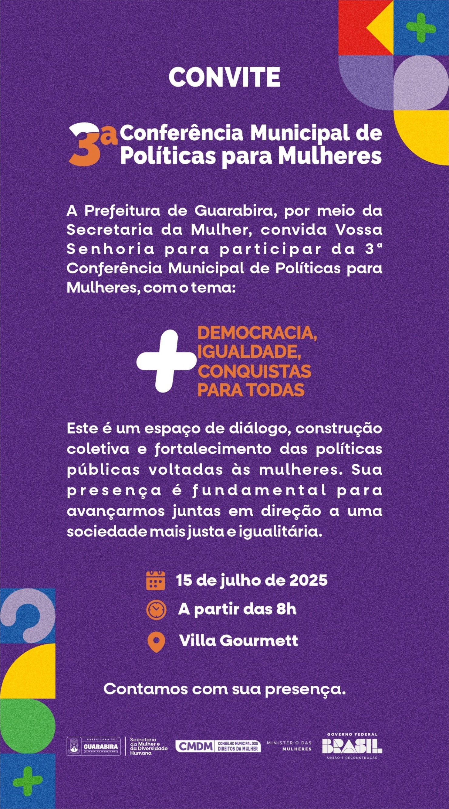 Vem aí a 3ª Conferência Municipal de Políticas Públicas para as Mulheres de Guarabira com o tema: "Mais Democracia, Mais Igualdade e Mais Conquistas para Todas"