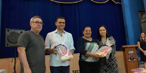 O prefeito Marcus Diôgo participou, nesta quinta-feira (07.07), do Circuito Pedagógico promovido pela Secretaria de Educação, no Teatro Geraldo Alverga. O chefe do Executivo compôs a mesa com a secretária da pasta Andréa Cavalcante e o vereador Raimundo Macedo e, na oportunidade, fez a entrega simbólica de materiais didáticos FTD da coleção “SAEB em Foco”.