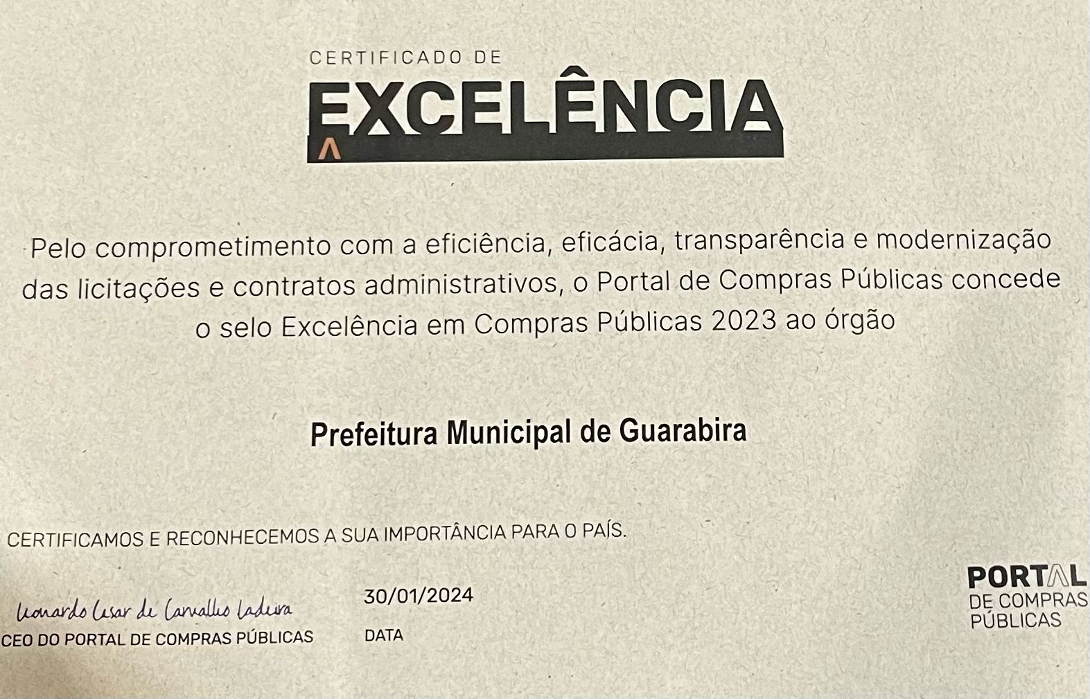 O Portal de Compras Públicas (PCP) concedeu o selo Excelência em Compras Públicas 2023 à Prefeitura Municipal de Guarabira pelo comprometimento com a eficiência, eficácia, transparência e modernização das licitações e contratos administrativos.