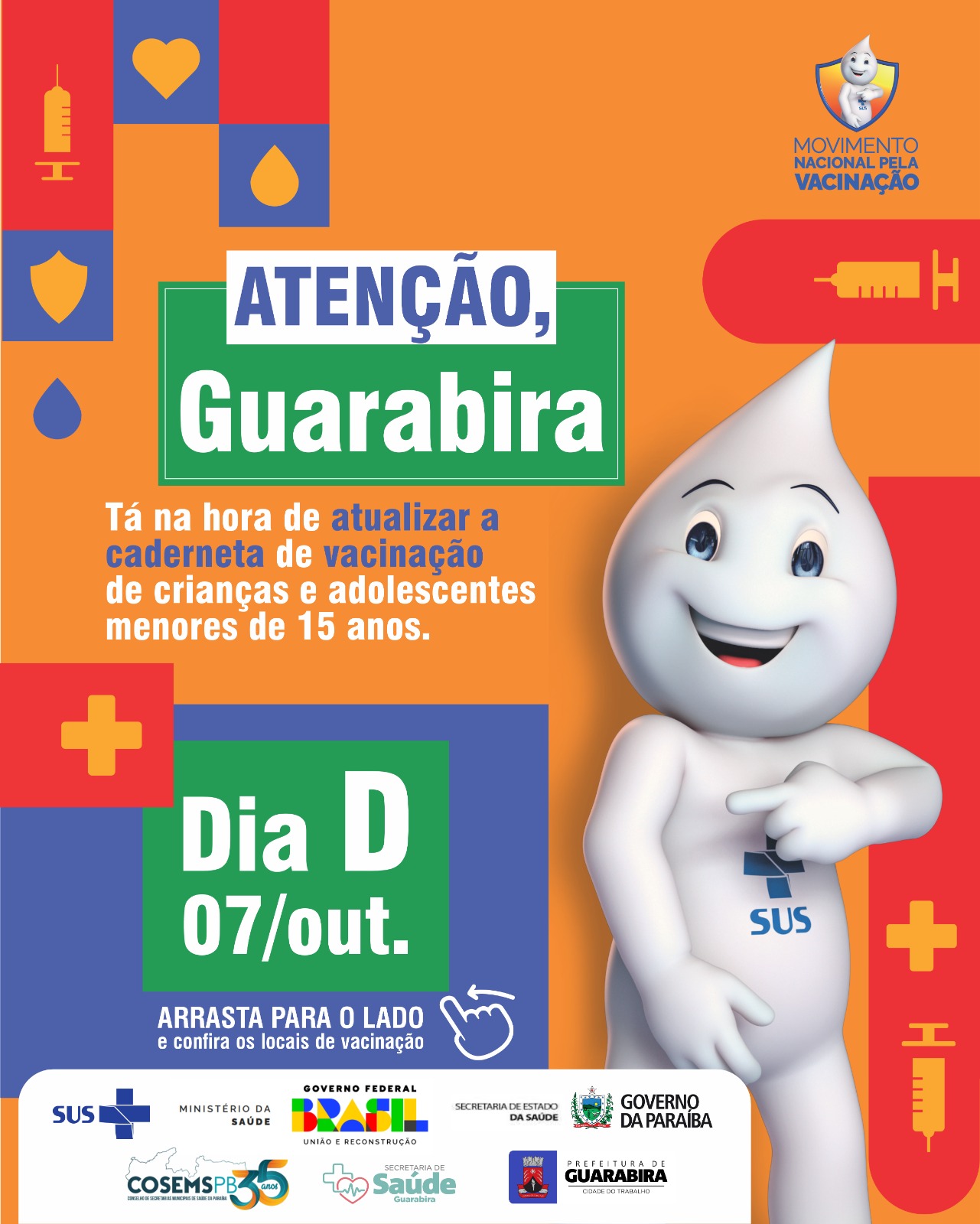 Dentro do Movimento Nacional pela Vacinação, a Prefeitura de Guarabira, por meio da sua Secretaria de Saúde, promove neste sábado, 7/10, o Dia D da Campanha de Multivacinação para Crianças e Adolescentes menores de 15 anos de idade. A mobilização tem como objetivo atualizar as cadernetas de vacinação deste público-alvo e mantê-lo protegido de várias doenças.