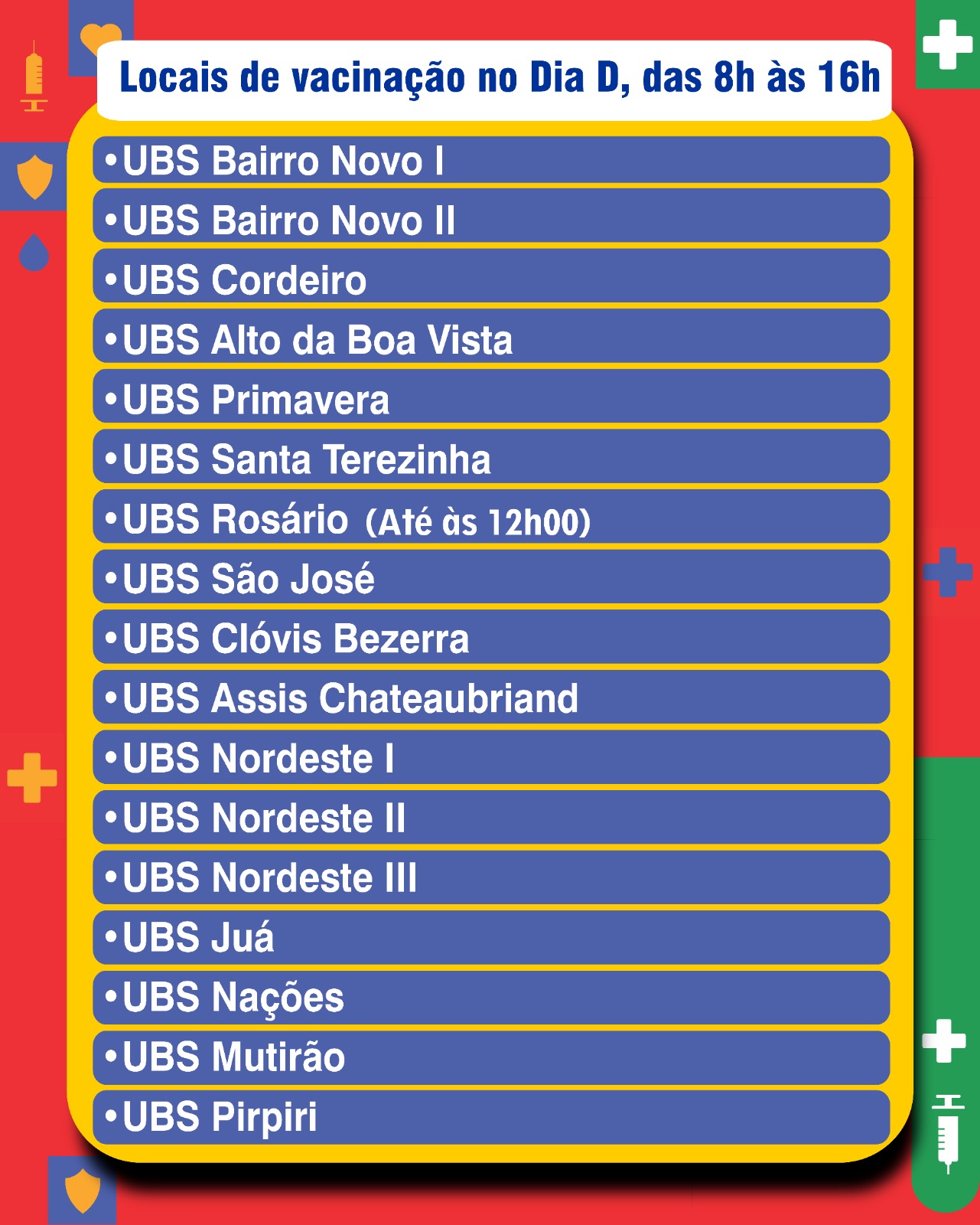 O Dia D será realizado da 8h às 16h, em todas as UBS da zona urbana e na Unidade do distrito de Pirpiri. Confira: Bairro Novo I, Bairro Novo II, Cordeiro, Alto da Boa Vista, Primavera, Santa Terezinha, Rosário (até às 12h), São José, Assis Chateaubriand, Clóvis Bezerra, Nordeste I, Nordeste II, Nordeste III, Juá, Nações, Mutirão e Pirpiri.