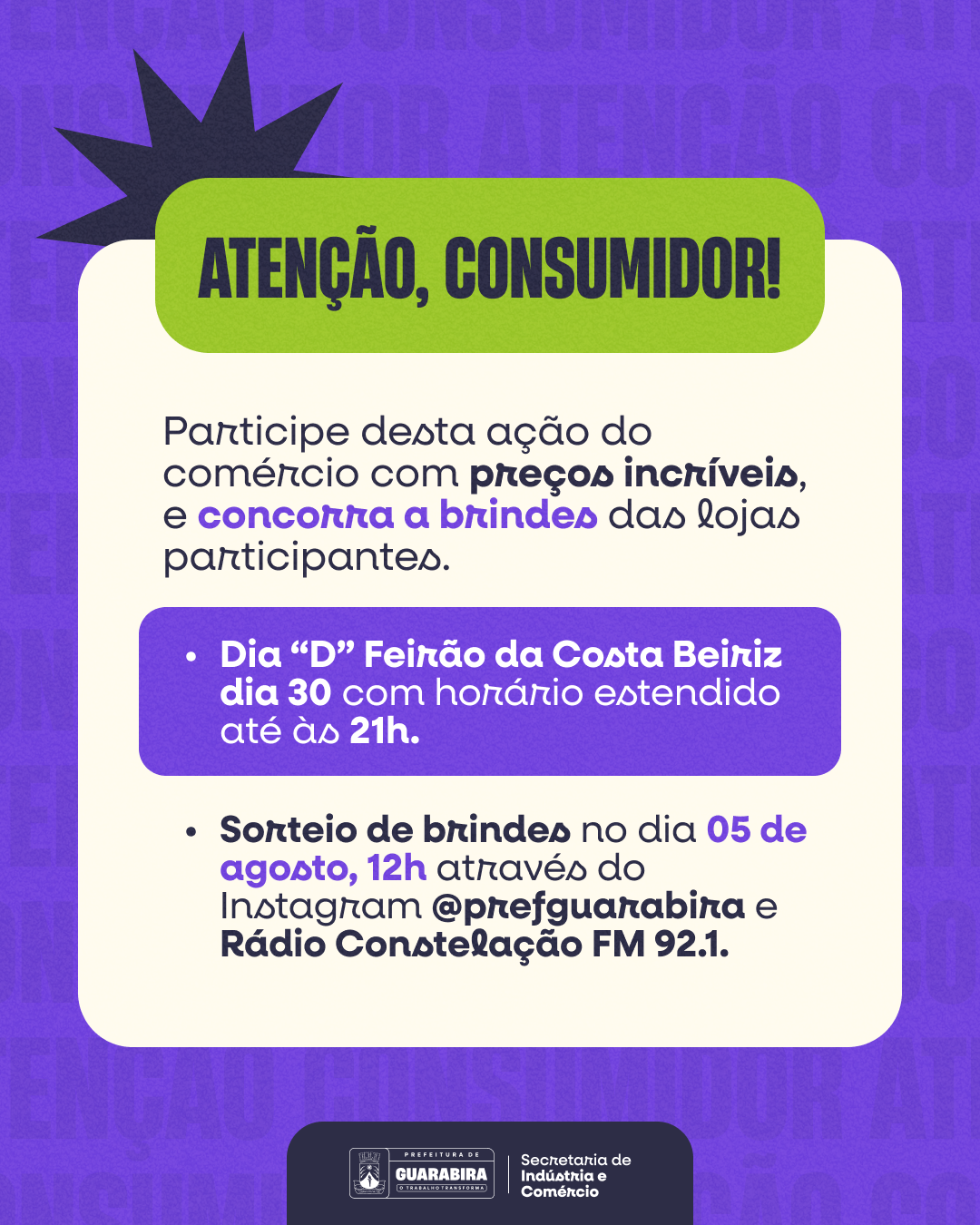 Como forma de atrair ainda mais o público e valorizar os clientes, o evento contará com um sorteio de brindes, que será realizado no dia 5 de agosto, ao meio-dia. Cada loja participante contribuirá com um item para o sorteio, que será transmitido ao vivo pelo perfil oficial da Prefeitura no Instagram (@prefguarabira) e pela rádio Constelação FM 92.1.