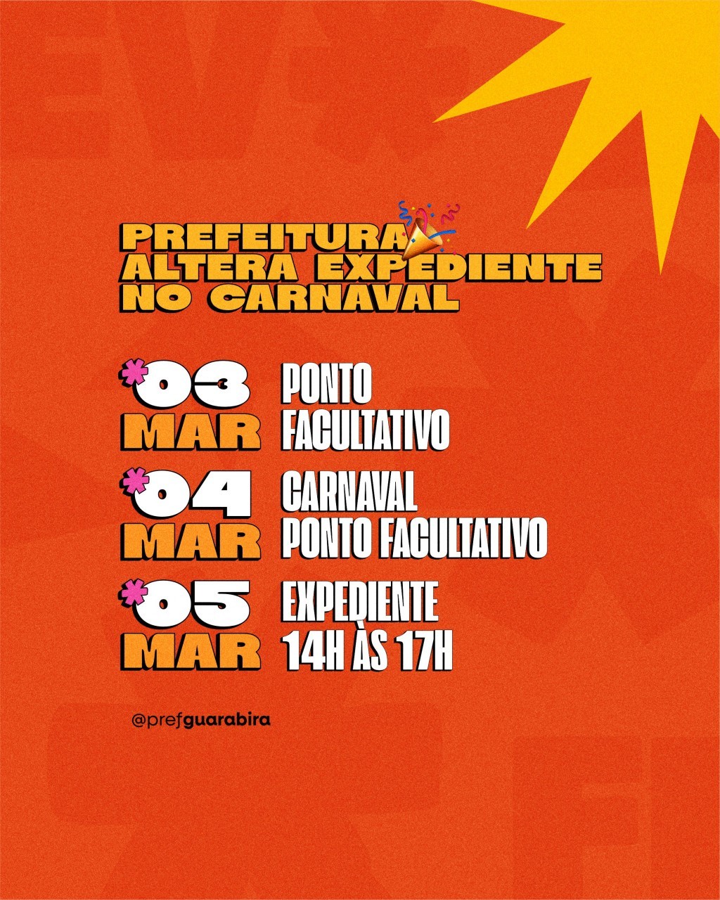 A Prefeitura de Guarabira comunica sobre a alteração no expediente dos órgãos municipais durante o período de Carnaval. De acordo com a Portaria Conjunta 01/2025, editado pelas Secretarias de Administração e de Planejamento para todo o ano, já estão previstos os dias 3 e 4 de março (segunda e terça-feira) como sendo de caráter facultativo, enquanto no dia 5 de março (quarta-feira de Cinzas) o funcionamento será, excepcionalmente, das 14h às 17h em todos os setores da administração pública municipal, incluindo a sede que costumeiramente atende em horário contrário.
