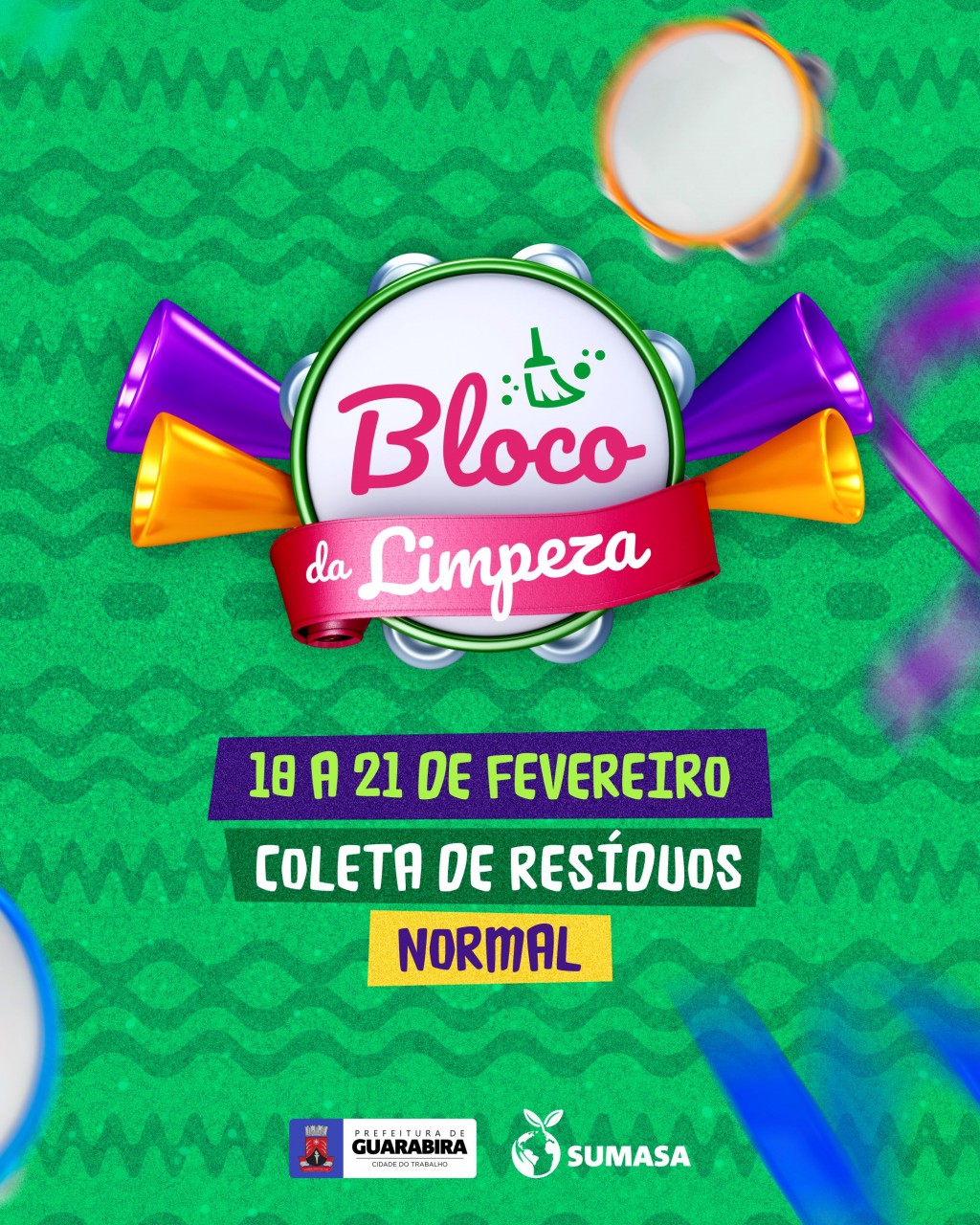 A coleta de lixo, no entanto, será mantida durante todo o período carnavalesco, de 18 a 21 de fevereiro, com o tradicional “Bloco da Limpeza” realizado pela SUMASA.