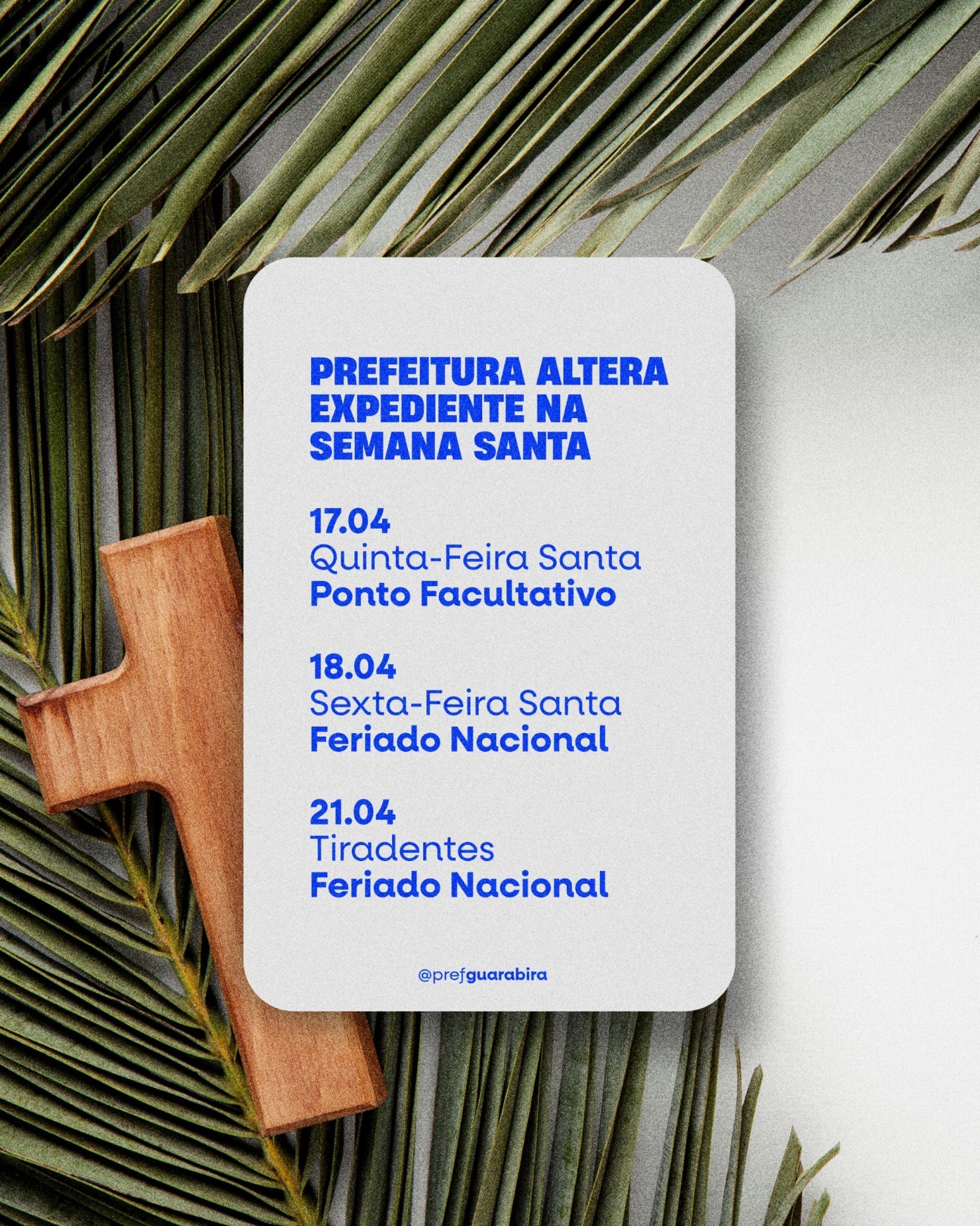 Na sexta-feira, 18 de abril, feriado nacional em alusão à Paixão de Cristo, não haverá expediente nas repartições públicas municipais. Além disso, o feriado de Tiradentes, celebrado em 21 de abril (segunda-feira), amplia o período de suspensão das atividades administrativas.
