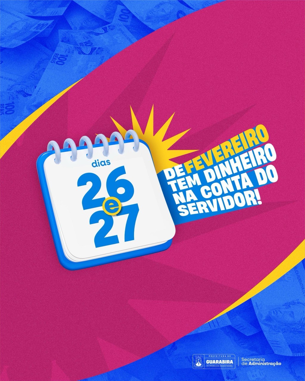 A Prefeitura de Guarabira, através da secretaria de Administração e da diretoria de Recursos Humanos, divulgou nesta sexta-feira, 21, o pagamento da folha dos servidores para os próximos dias 26 e 27 de fevereiro, quarta e quinta-feira, antes do carnaval.