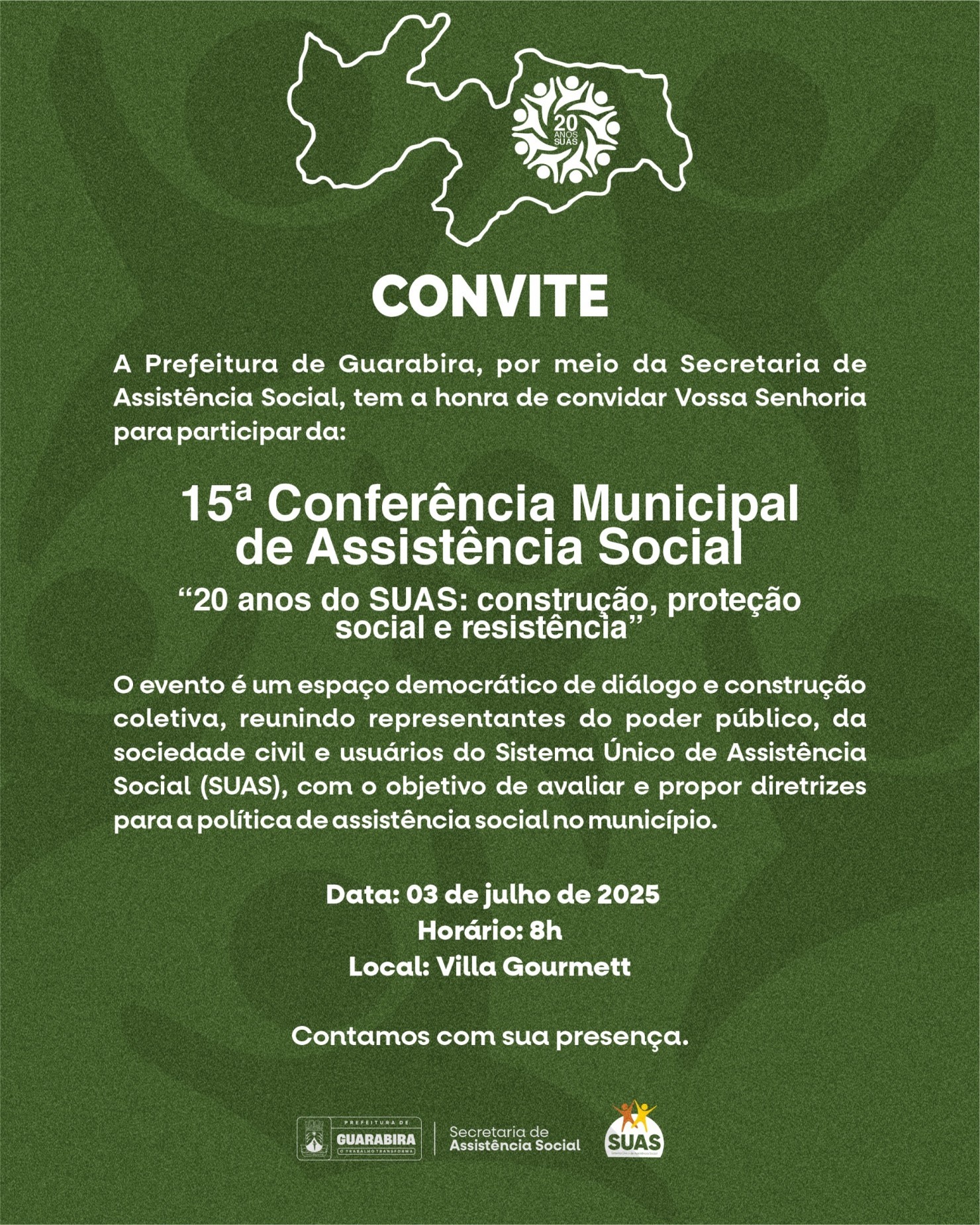 A Prefeitura de Guarabira, por meio da Secretaria de Assistência Social, realizará no próximo dia 3 de julho de 2025, a 15ª Conferência Municipal de Assistência Social, com o tema: “20 anos do SUAS: construção, proteção social e resistência”. O evento acontecerá a partir das 8h, na Villa Gourmett, e contará com a participação de representantes do poder público, da sociedade civil e de usuários do Sistema Único de Assistência Social (SUAS).