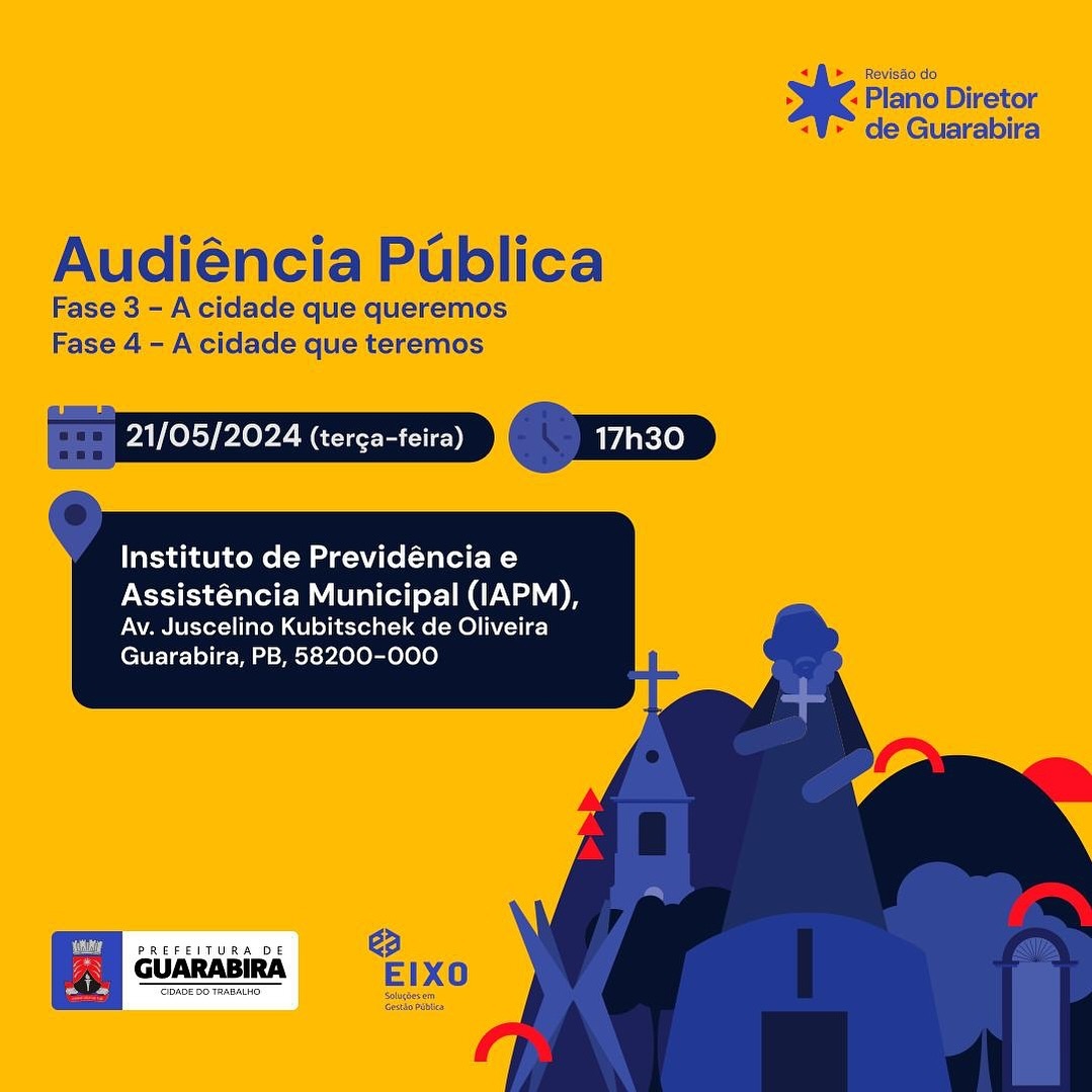 A Secretaria de Planejamento do Município de Guarabira convida para a realização da audiência pública de revisão do Plano Diretor de Guarabira – Fases 03 e 04, Propostas, instrumentos e parâmetros, que será realizada na próxima terça-feira (21 de maio).