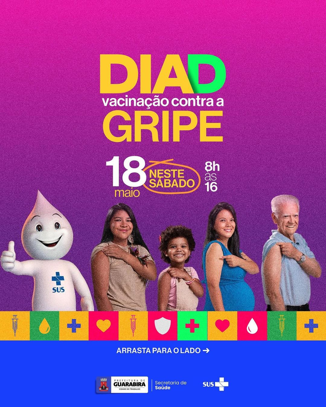 A Prefeitura de Guarabira, por meio da sua Secretaria de Saúde, realiza neste sábado, 18 de maio, mais um Dia D de vacinação contra a influenza (gripe). Além da vacina contra a gripe estarão disponíveis todos os imunizantes do calendário vacinal; tendo como objetivo atualizar a caderneta vacinal, e facilitar o acesso da população a todas as vacinas, inclusive contra a influenza que foi ampliada para todas as pessoas acima de seis meses de idade.