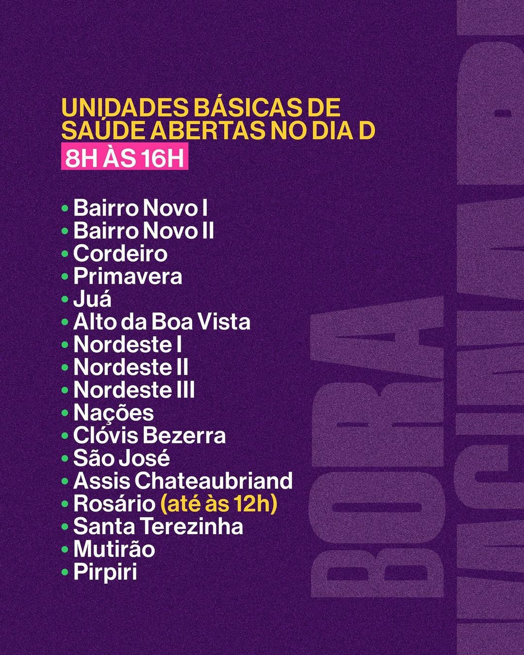 De acordo com a Coordenação de Vigilância Epidemiológica e Imunização, a mobilização acontece das 8h às 16h em todas as Unidades Básicas de Saúde da zona urbana, incluindo as seguintes UBSs: Bairro Novo I, Bairro Novo II, Alto da Boa Vista, Cordeiro, Primavera, Juá, Nações, Nordeste I, Nordeste II, Nordeste III, Santa Terezinha, São José, Rosário (até às 12h), Assis Chateaubriand, Clóvis Bezerra, Mutirão e na unidade do distrito de Pirpiri.
