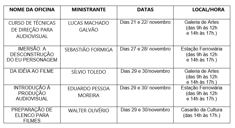 Os interessados podem se inscrever em mais de uma oficina, desde que não haja coincidência de horários entre as mesmas. Segue a tabela com a lista de oficinas, locais, datas e horários de funcionamento.