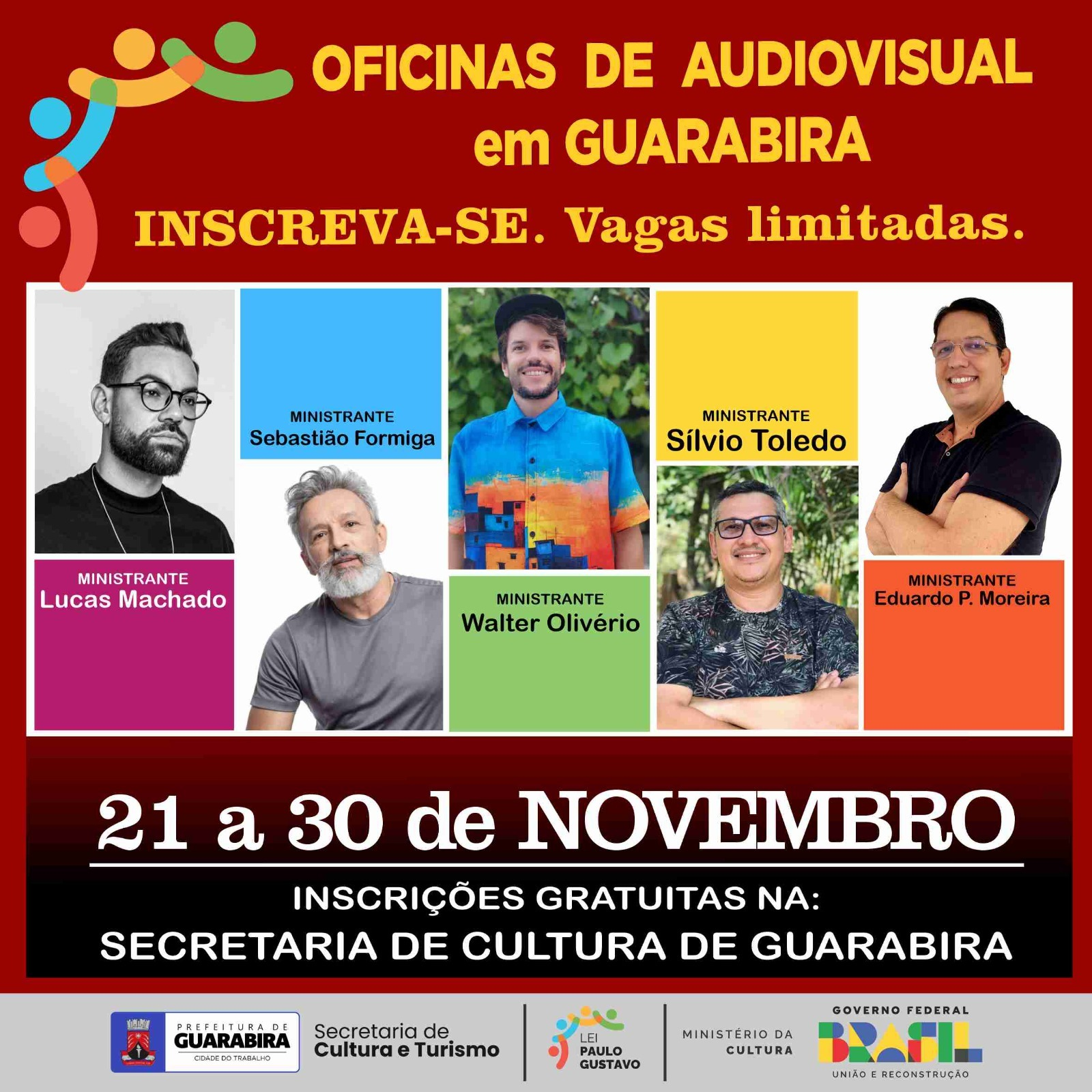 A Secretaria de Cultura de Guarabira está com inscrições abertas, a partir desta quarta-feira (06/11), para 05 oficinas de audiovisual que serão ministradas entre os dias 21 e 30 de novembro. As inscrições são gratuitas e as vagas limitadas, e podem ser realizadas presencialmente na sede da própria secretaria, localizada na Estação Ferroviária da cidade.