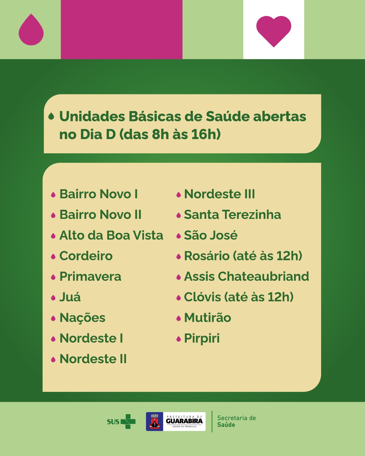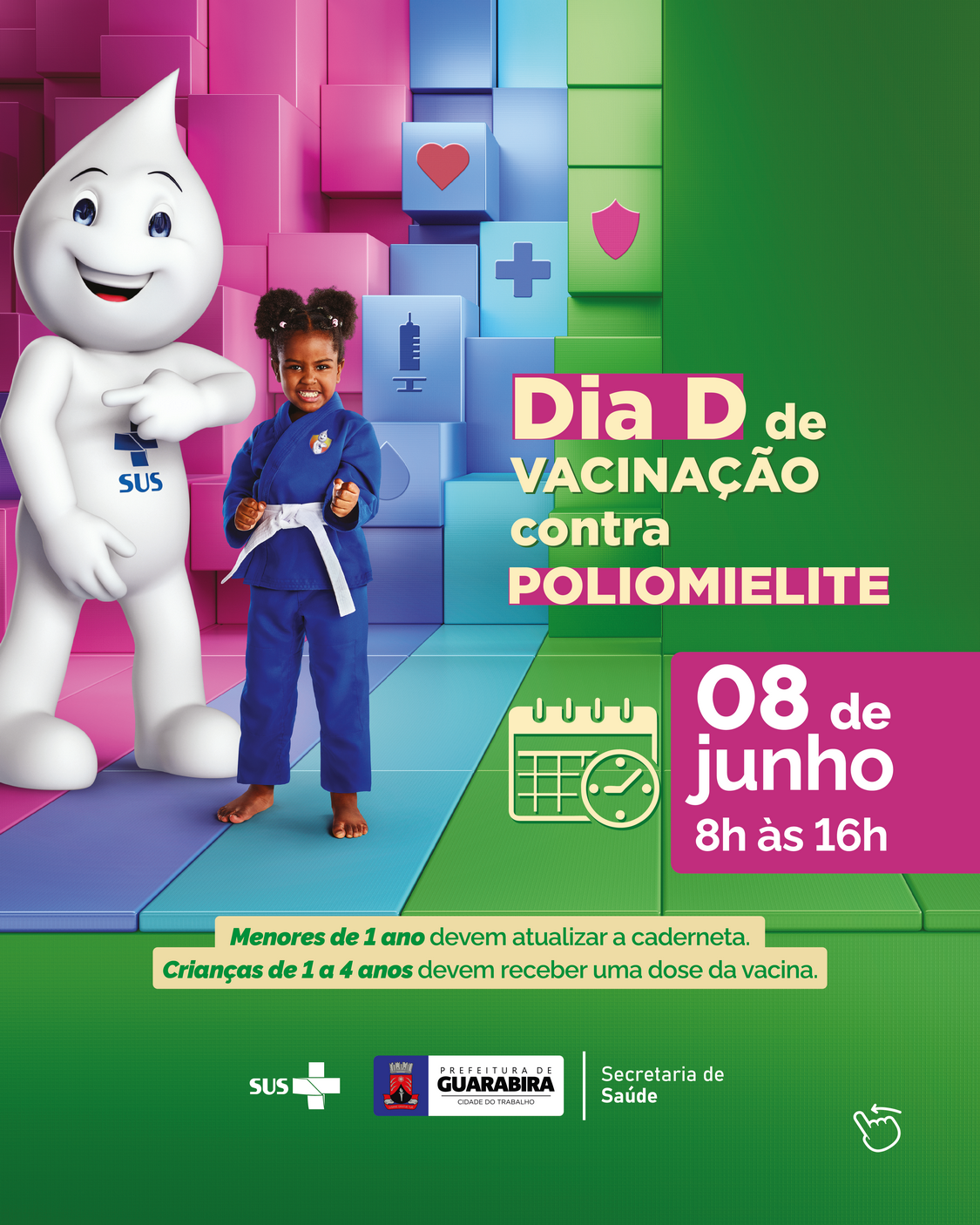 A Prefeitura de Guarabira por meio da sua Secretaria de Saúde realiza neste sábado, 8 de junho, o Dia D da Campanha de Vacinação contra Poliomielite. A mobilização é realizada em consonância com o Ministério da Saúde que iniciou a campanha em 27 de maio e se estende até 14 de junho.